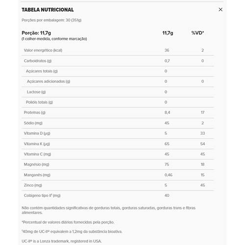 > 40mg Colágeno Tipo II Não Desnaturado e Não hidrosilado UCII;